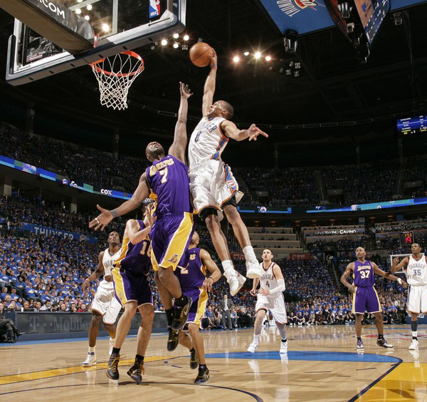 But now THAT shot finally presented itself. Westbrook, probably fed up with always having to play catch-up in the previous 2 and a half games, faked like he was going to drive right towards a Durant/Nick Collison double screen. As he turned Derek Fisher (yes, he played for the Lakers at one time), he crossed over and instead drove hard to his left. Two dribbles and two steps and Westbrook went airborne. Lamar Odom attempted to block Westbrook’s shot, but he got to the rim late and, as is the case for shot blockers, became part of a poster.