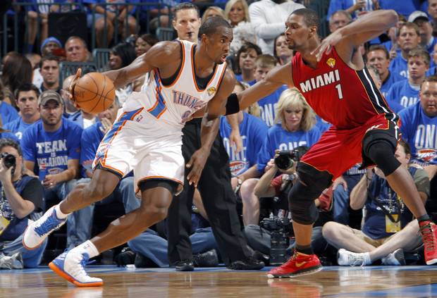 2. Third Wheels – The key to this match-up has been the 3rd wheels (Chris Bosh and Serge Ibaka). After years of inconsistency on the offensive end, Ibaka seems to finally be comfortable in his role as the 3rd option/release valve for both Durant and Westbrook. His 22 points, 8 rebounds effort was part of the reason the Thunder were able to weather the storm early in the first game and finally take over in the second half.